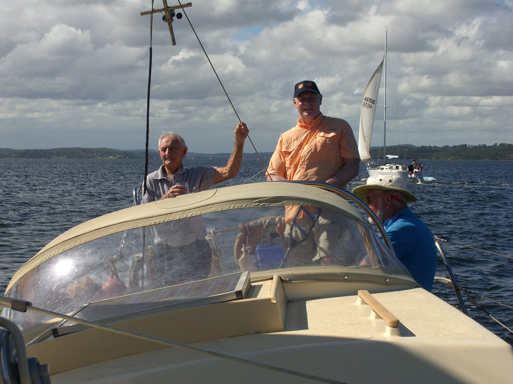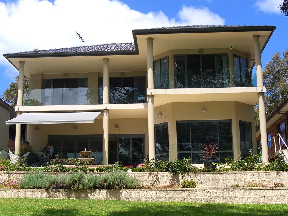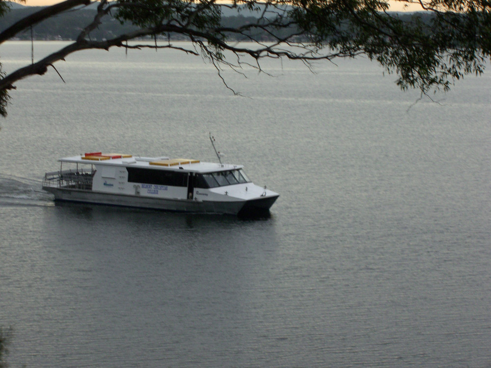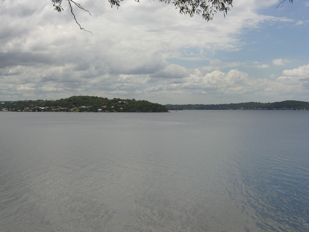 The back of Judy & Michael's place, looking out across Lake MacQuarie. The foreshore area behind there house is about 50 yards, and then the lake. The neighbor has a 38 foot yacht moored just a 100 yards off shore and that's where we went sailing.