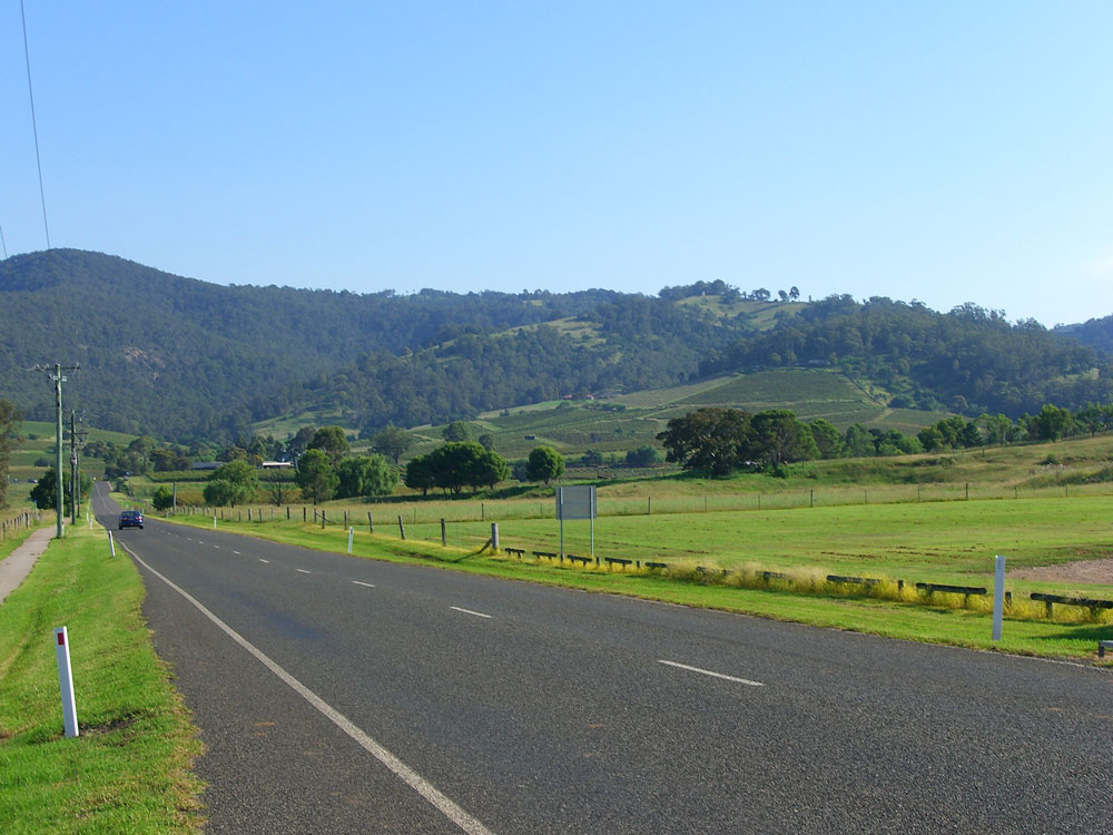 Hunter Valley. Green (surprising, but they have had a lot of rain) countryside with vineyards on the hill.