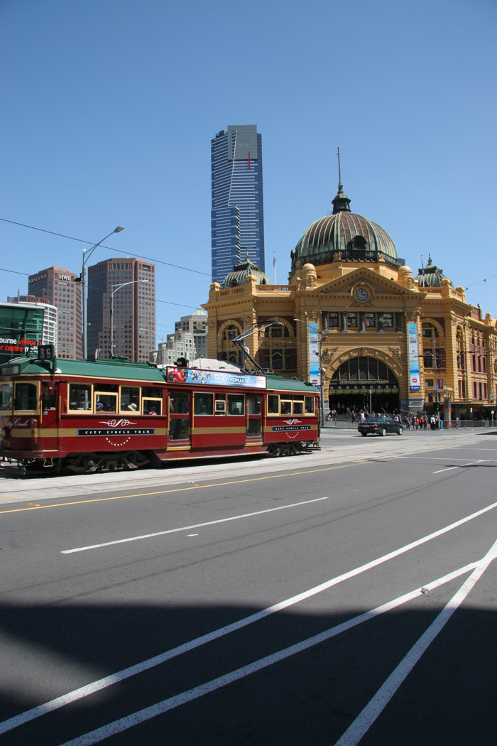 Classic Melbourne - A tram, Flinders Street station and the modern 90 storey Eureka Skydeck in the back ground.