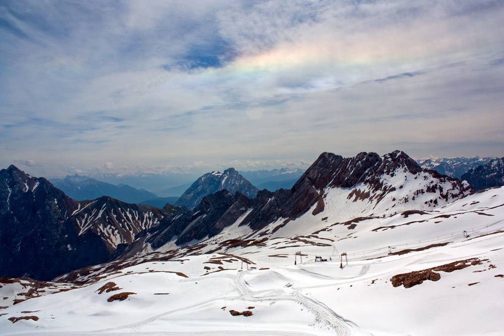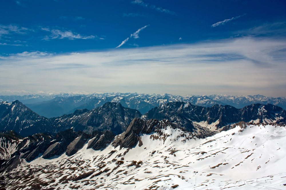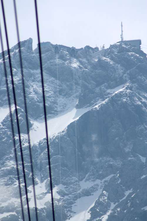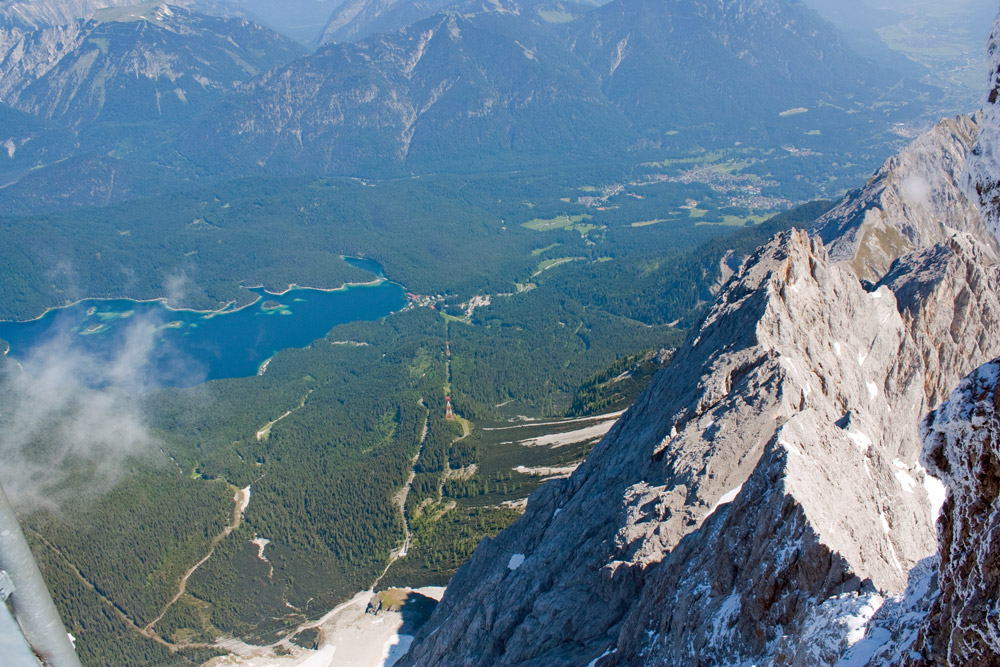 The top of the Zugspitze, the highest mountain in Germany, 2964 metres, just under 10,000 feet. Looking back down to the start of the cable car, next to the Eibsee lake.
