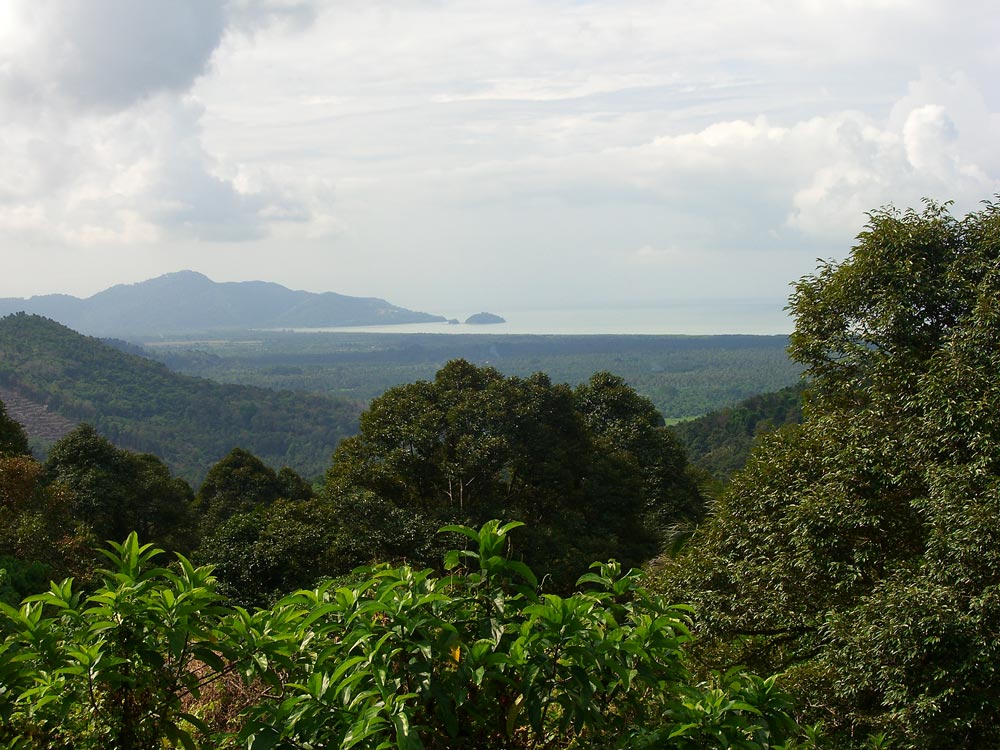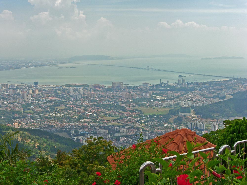 View from the top of Penang Hill, 700 meters. Looking south east towards Butterworth and the bridge to the mainland can be seen in the haze.