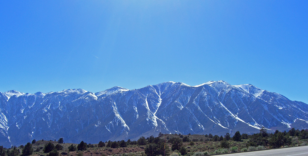 The road to Bishop, on my way to Mammoth Lakes, with the Sierra Nevada mountains looming on the left.