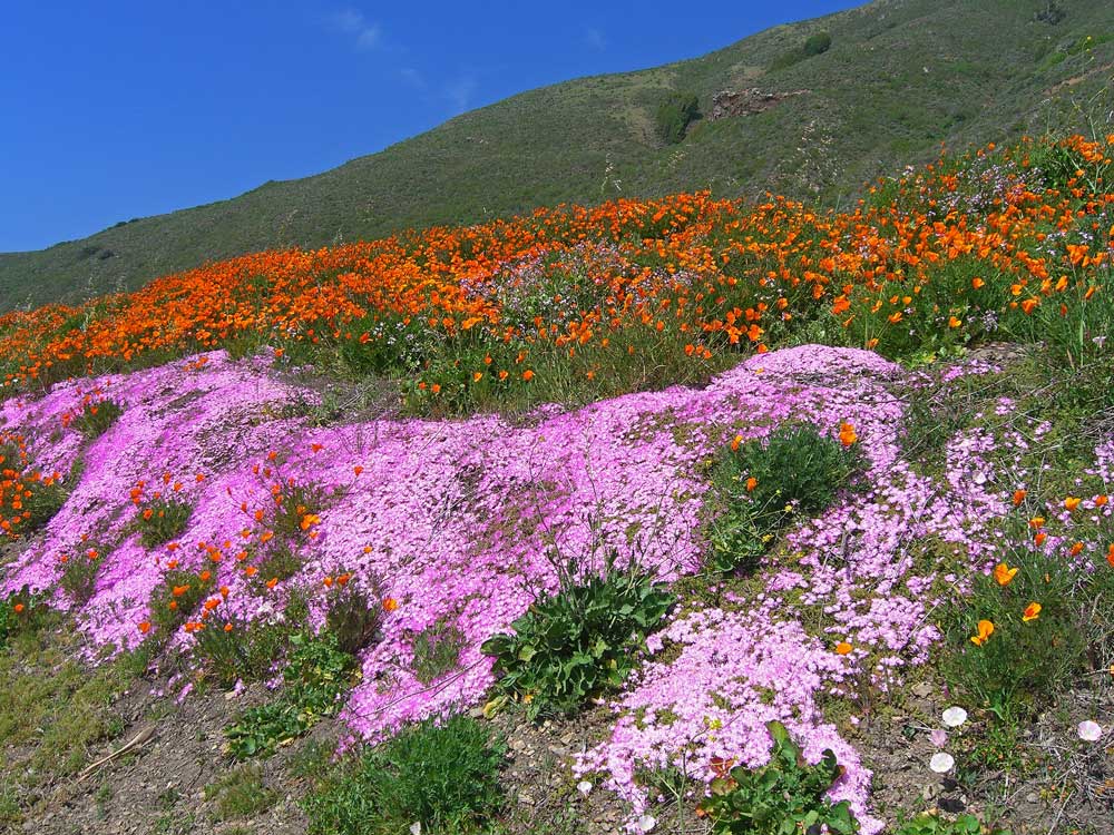 Some of the coastal flora, California Poppies and some sort of pink daisy, which seems to be all over the place.